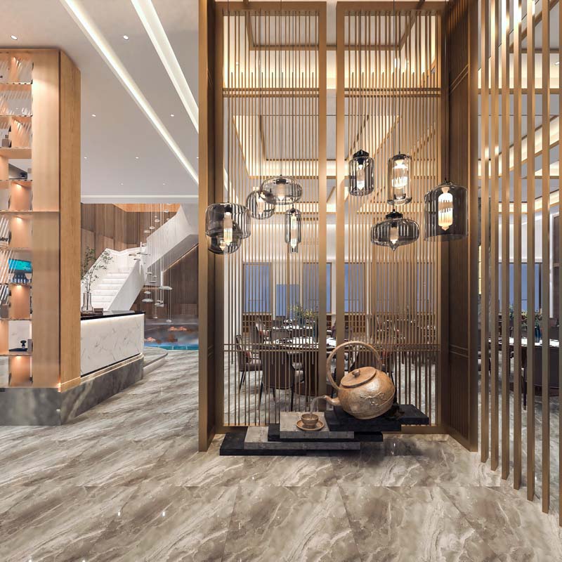 基于現(xiàn)代輕奢感“高檔宴會(huì)型餐廳”定位,為滿足消費(fèi)者的視覺、觸覺等諸多感官體驗(yàn),覃工選擇著重使用深淺不一的木色作為基礎(chǔ)色調(diào),搭配淺金色裝飾線條,分布在燈具、吊頂、屏風(fēng)線條等位置,突出打造“莊重、恢弘”的餐廳氛圍感。