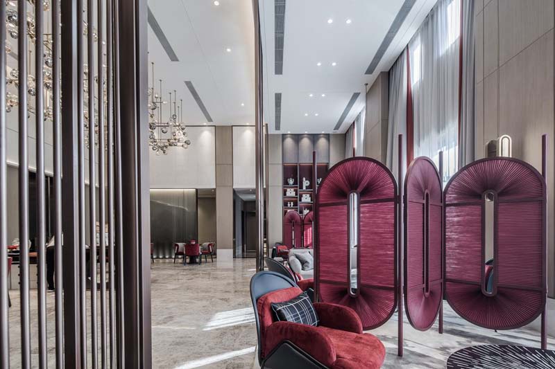 為了更好的提升整體檔次,為進(jìn)店業(yè)主營(yíng)造更多的舒適感與信任感,從而起到銷(xiāo)售中的促進(jìn)作用。設(shè)計(jì)師將精致軟裝設(shè)計(jì)發(fā)揮到極致:自帶藝術(shù)造型感根雕、紅與黑的布藝靠背沙發(fā)、及頂木質(zhì)書(shū)架展示柜……帶來(lái)的不止有美觀的視覺(jué)效果,更能讓業(yè)主真切的感受到舒適自在的家庭氛圍,從而促進(jìn)購(gòu)買(mǎi)決心。